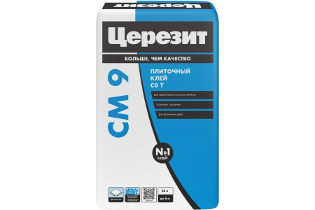 Клей для плитки Церезит СМ 9 для внутренних работ, класс C0T, 25 кг 792209 состоит из цемента с минеральными заполнителями и полимерными модификаторами. Применяется для крепления керамической плитки размером до 30х30 см на полах и стенах внутри помещений.